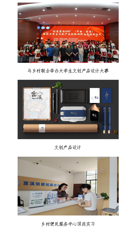 (2)乡村振兴+竞赛。项目在柘荣县富溪镇开展活动时,根据乡村振兴现实需要,牵头举办“创意富溪”(中国·富溪)海峡大学生文创产品设计大赛,发动海峡高校创意精英和设计团队,通过整合创新创意要素,促进“文创内容”与“产品载体”相结合,进一步激发实践地富溪镇文创产业活力,带动文创产业与实体经济相结合,释放文创产业融合性、附加值高的优势,促进“人文富溪”建设,打造涵盖IP研发、IP保护、IP输出、IP转化、产品营销五大链条的富溪文创产业生态圈,促进“产学研”文化创意与相关产业的融合发展,实现海峡高校创意设计贴近生活、服务经济社会。项目积累“富溪模式”经验,形成可复制的实践品牌。