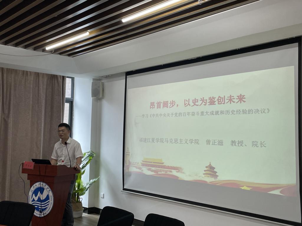 为进一步深入学习贯彻习近平新时代中国特色社会主义思想,激励和动员师生员工以优异成绩喜迎党的二十大的胜利召开,马克思主义学院于5月31日在行政楼5楼多功能研讨会议室举行“昂首阔步,以史为鉴创未来——学习《中共中央关于党的百年奋斗重大成就和历史经验的决议》”主题讲座,特邀福建江夏学院马克思主义学院院长曾正滋教授莅临我院作宣讲报告。
